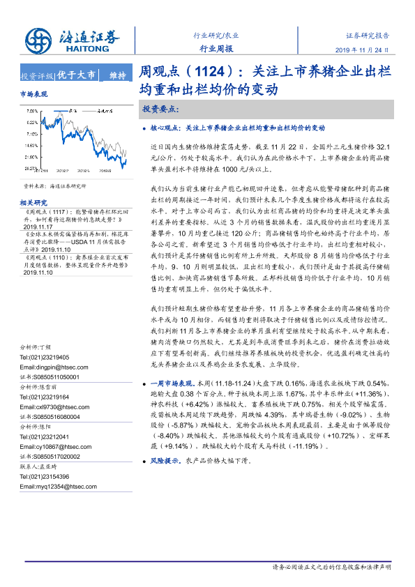 【海通证券】【20191124】周观点(1124):关注上市养猪企业出栏均重和出栏均价的变动-4页