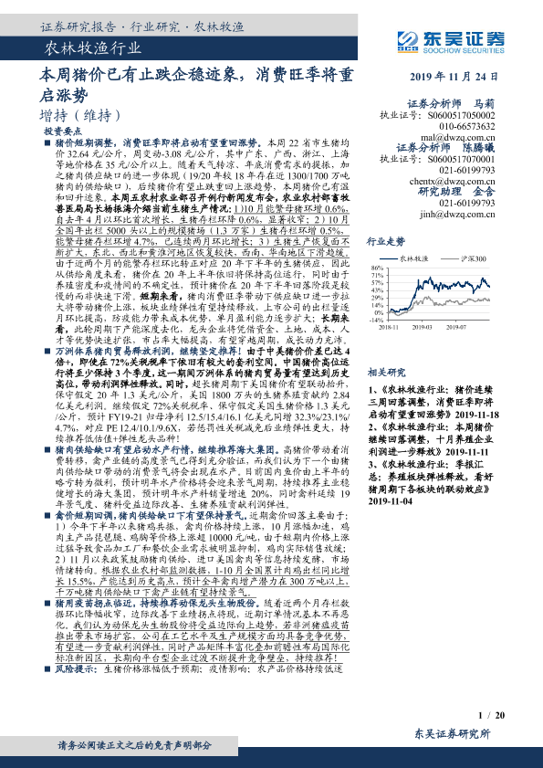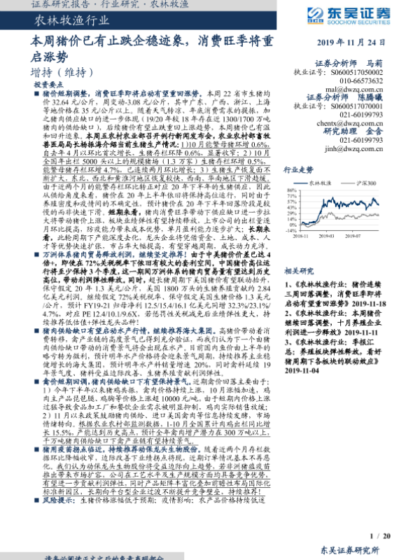 【东吴证券】【20191124】20191124-东吴证券-农林牧渔行业:本周猪价已有止跌企稳迹象,消费旺季将重启涨势-20页