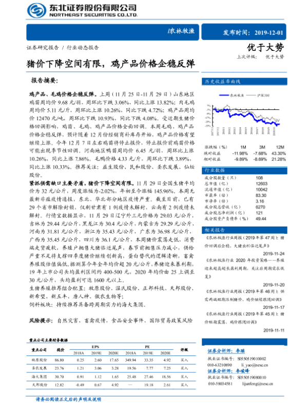 【东北证券】【20191201】20191201-东北证券-农林牧渔行业动态报告:猪价下降空间有限,鸡产品价格企稳反弹-11页