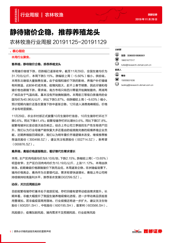 【西部证券】【20191129】20191129-西部证券-农林牧渔行业周报:静待猪价企稳,推荐养殖龙头-12页