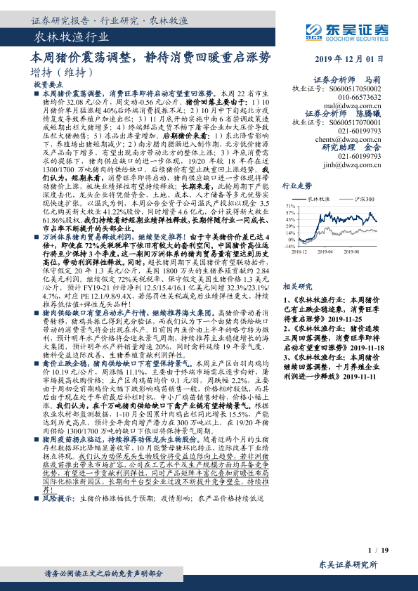 【东吴证券】【20191201】20191201-东吴证券-农林牧渔行业:本周猪价震荡调整,静待消费回暖重启涨势-19页