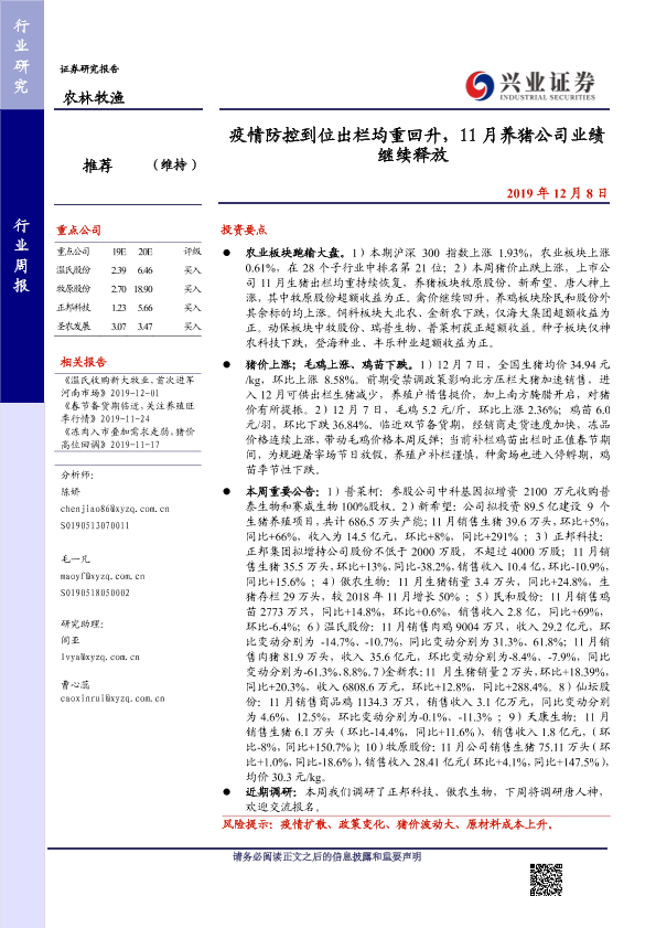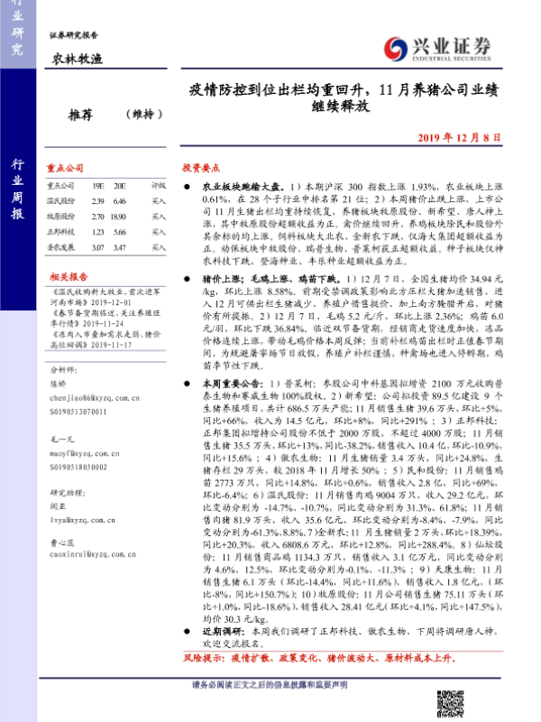 【兴业证券】【20191208】疫情防控到位出栏均重回升,11月养猪公司业绩继续释放-15页