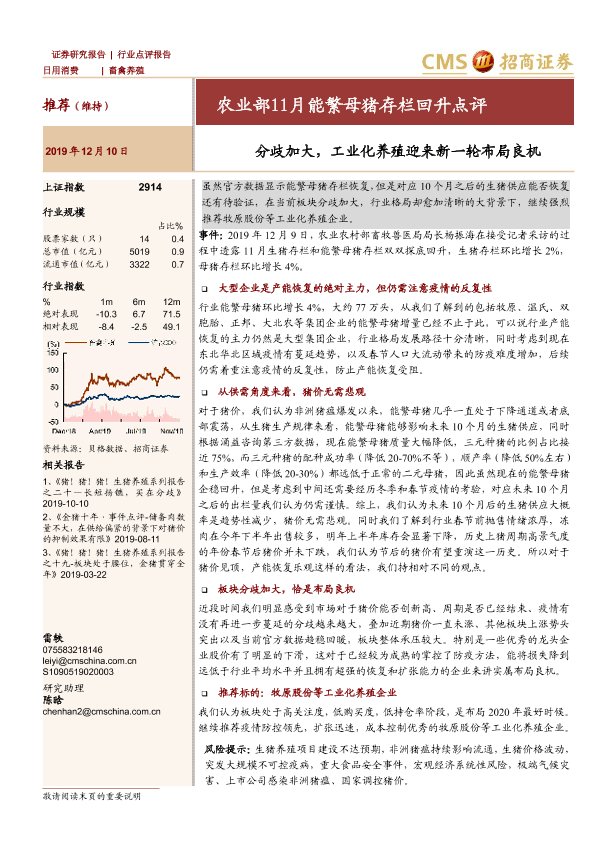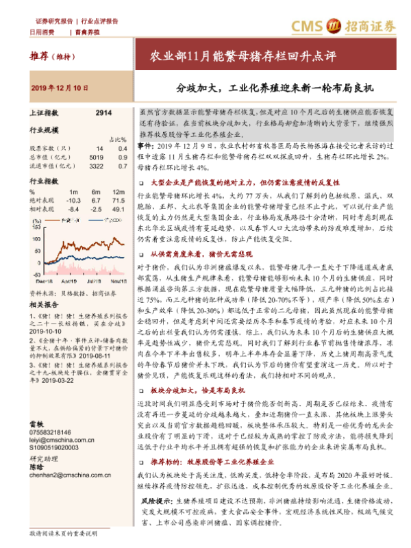 【海通证券】【20191210】农业部11月能繁母猪存栏回升点评:分歧加大,工业化养殖迎来新一轮布局良机-6页