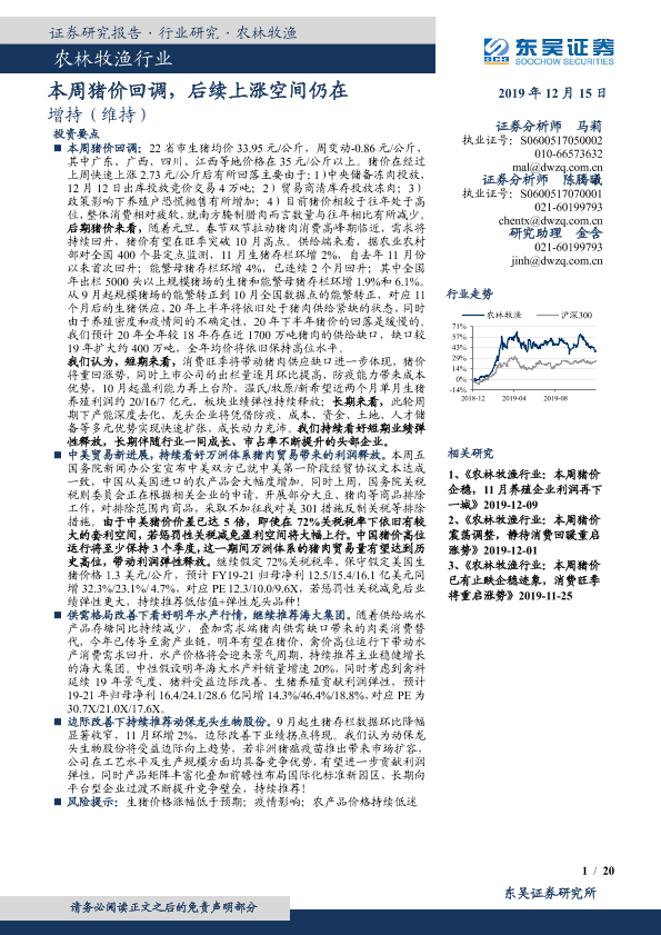 【东吴证券】【20191215】20191215-东吴证券-农林牧渔行业:本周猪价回调,后续上涨空间仍在-20页