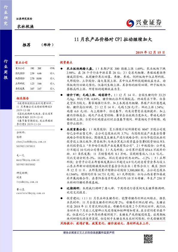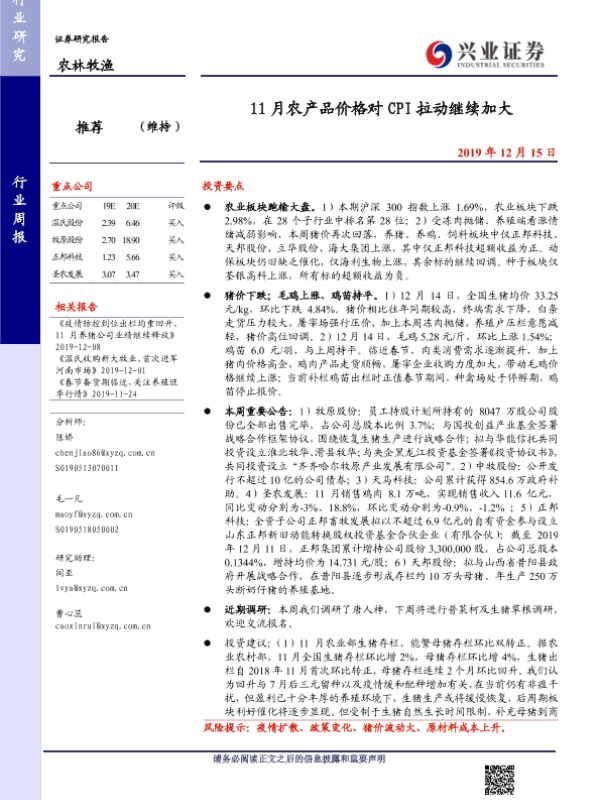 【兴业证券】【20191215】20191215-兴业证券-农林牧渔行业周报:11月农产品价格对CPI拉动继续加大-15页