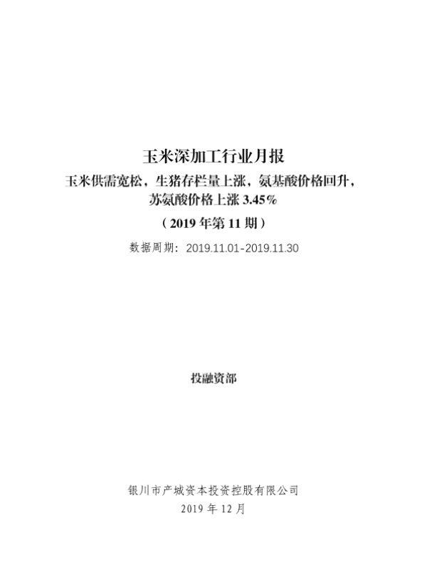 【银川市产城资本投资控股有限公司】【201912】20191217-产城资本-玉米深加工行业月报:玉米供需宽松,生猪存栏量上涨,氨基酸价格回升,苏氨酸价格上涨3.45%(2019年第11期)-9页