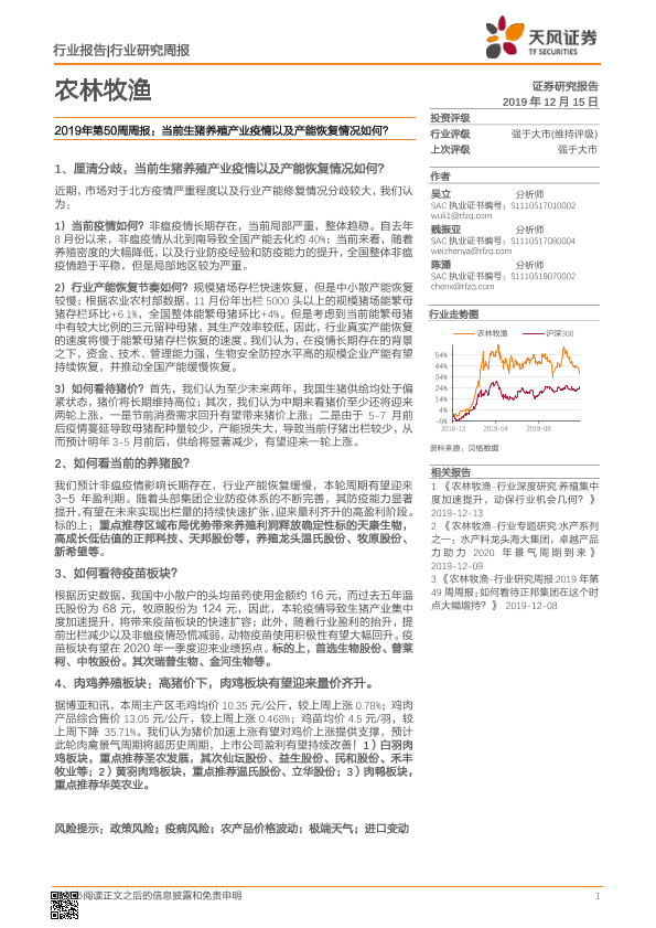 【天风证券】【20191215】2019年第50周周报:当前生猪养殖产业疫情以及产能恢复情况如何?-14页