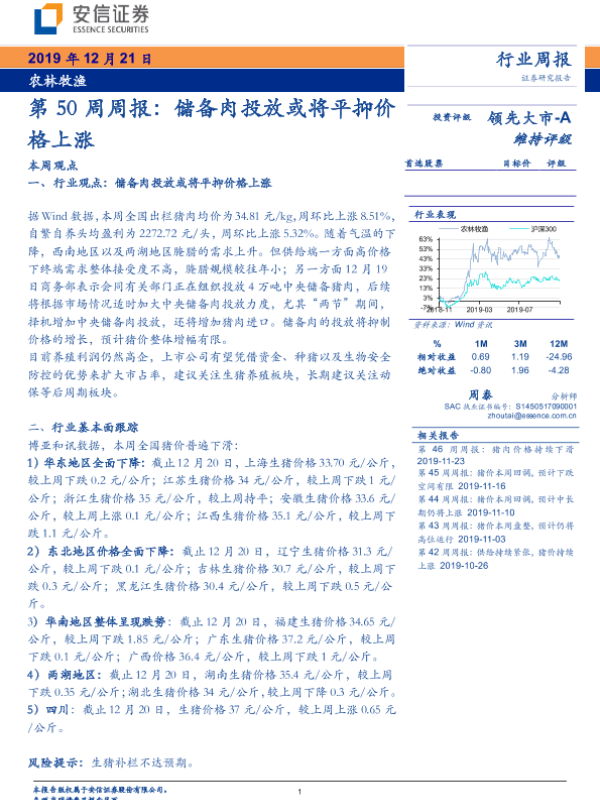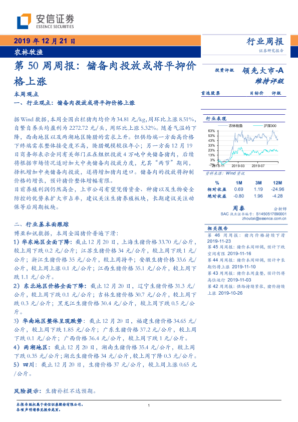 【安信证券】【20191221】农林牧渔第50周周报:储备肉投放或将平抑价格上涨-20页