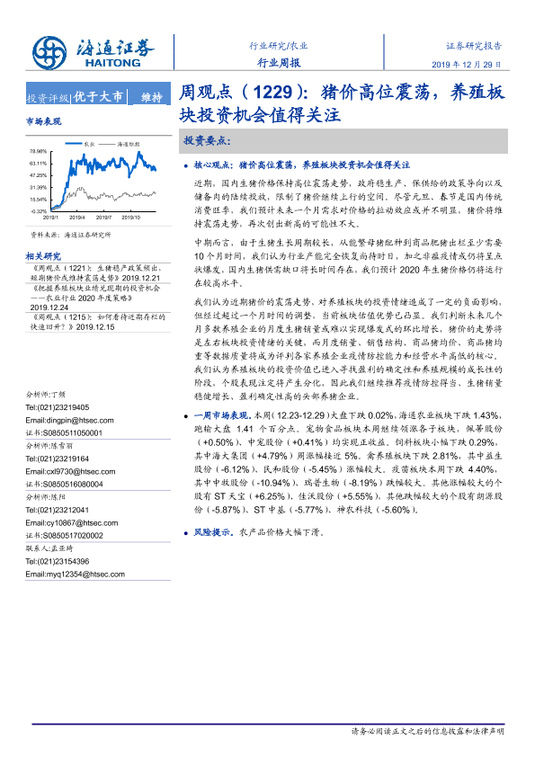 【海通证券】【20191229】20191229-海通证券-农业周观点:猪价高位震荡,养殖板块投资机会值得关注-4页