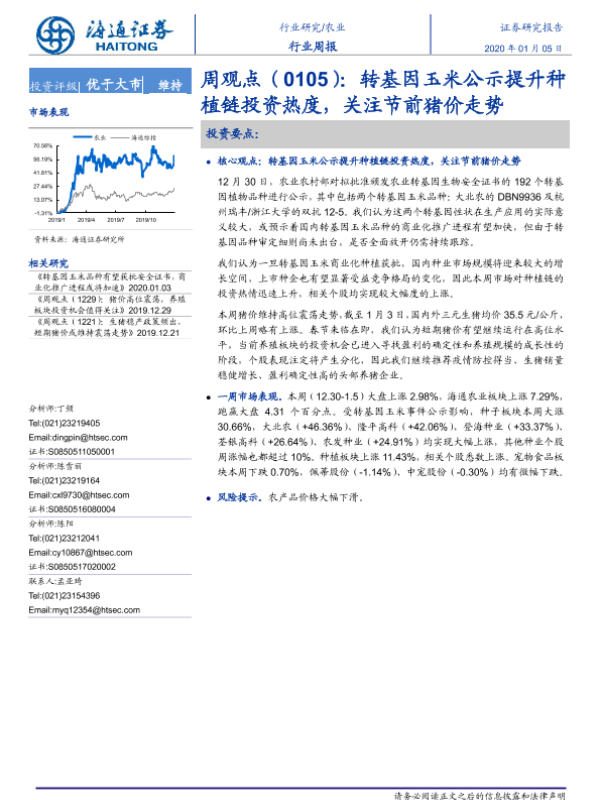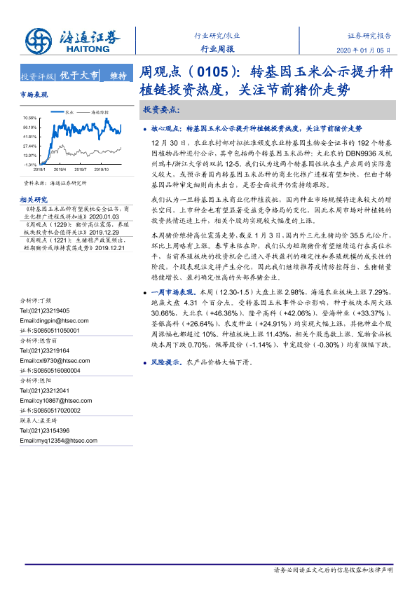 【海通证券】【20200105】20200105-海通证券-农业周观点:转基因玉米公示提升种植链投资热度,关注节前猪价走势-4页