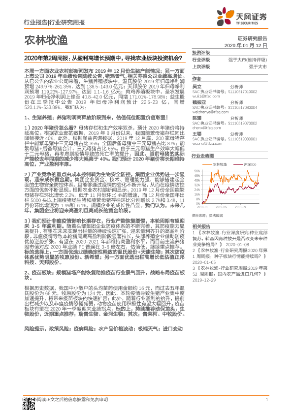 【天风证券】【20200112】农林牧渔2020年第2周周报:从盈利高增长预期中,寻找农业板块投资机会?-14页