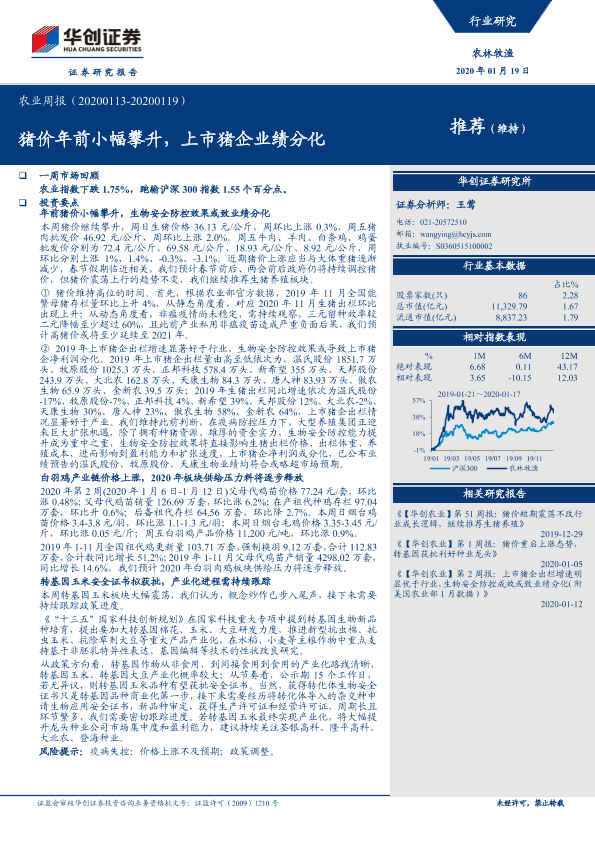 【华创证券】【20200119】20200119-华创证券-农业周报:猪价年前小幅攀升,上市猪企业绩分化-45页