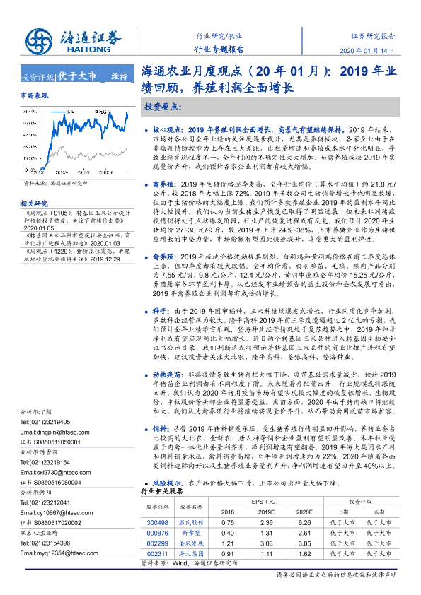 【海通证券】【202001】海通农业月度观点(20年01月):2019年业绩回顾,养殖利润全面增长-20页