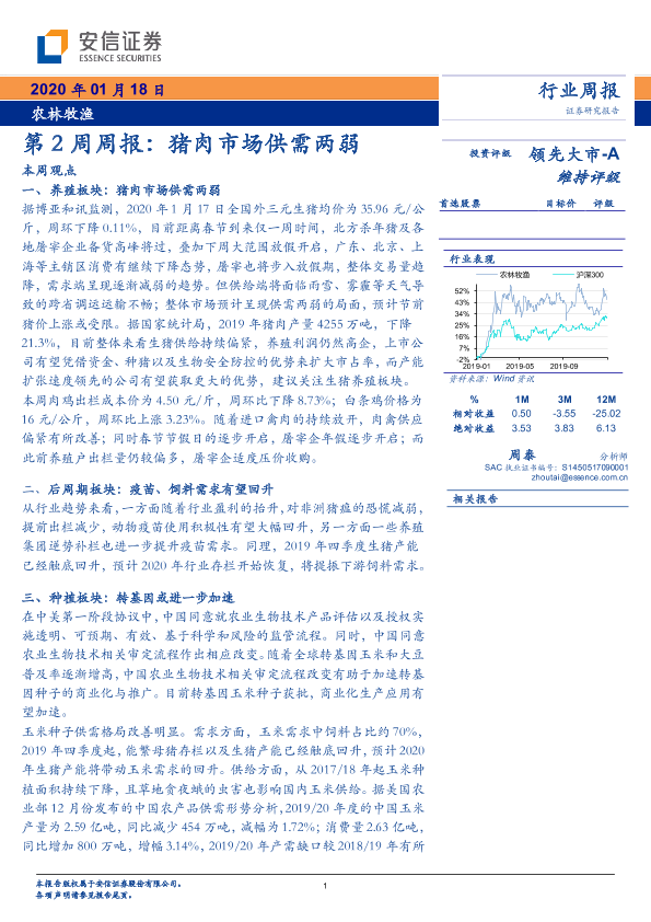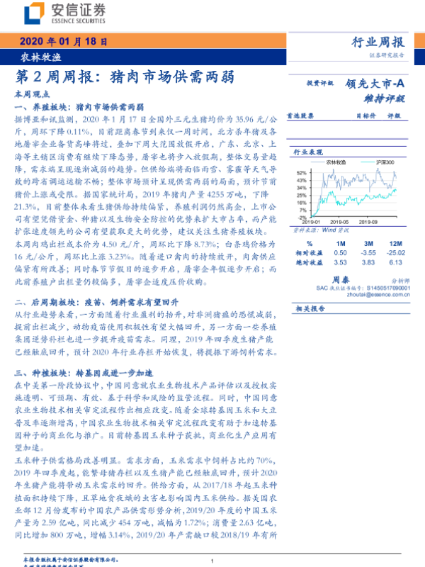 【安信证券】【20200118】20200118-安信证券-农林牧渔第2周周报:猪肉市场供需两弱-20页