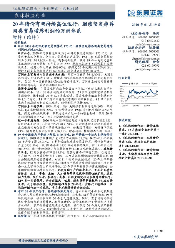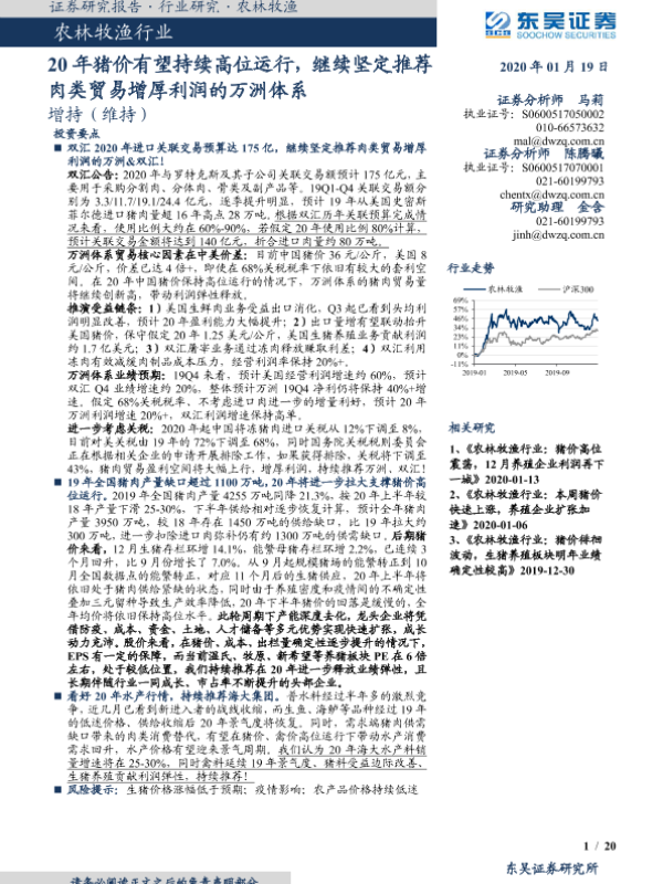【东吴证券】【20200119】20200119-东吴证券-农林牧渔行业跟踪周报:20年猪价有望持续高位运行,继续坚定推荐肉类贸易增厚利润的万洲体系-20页