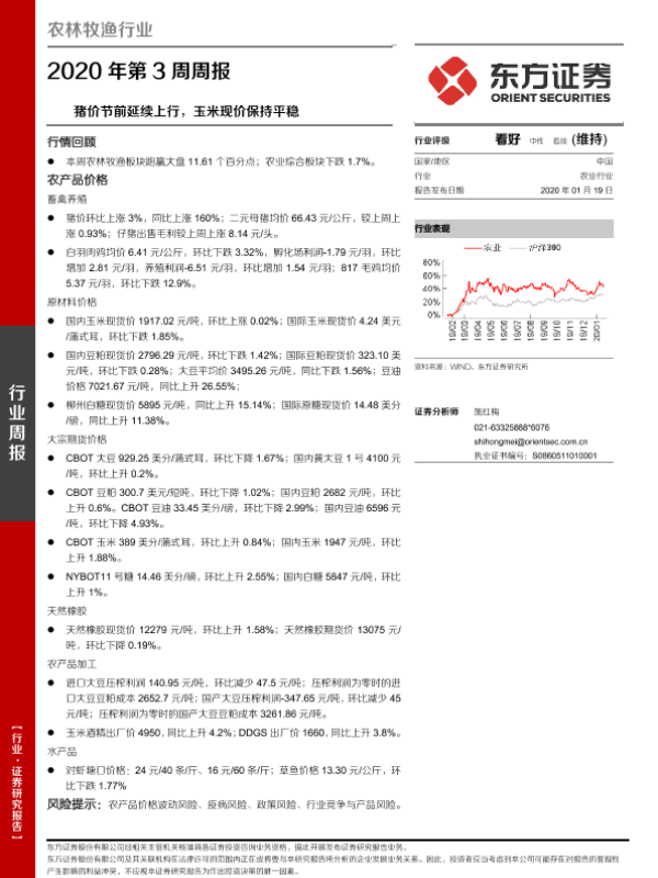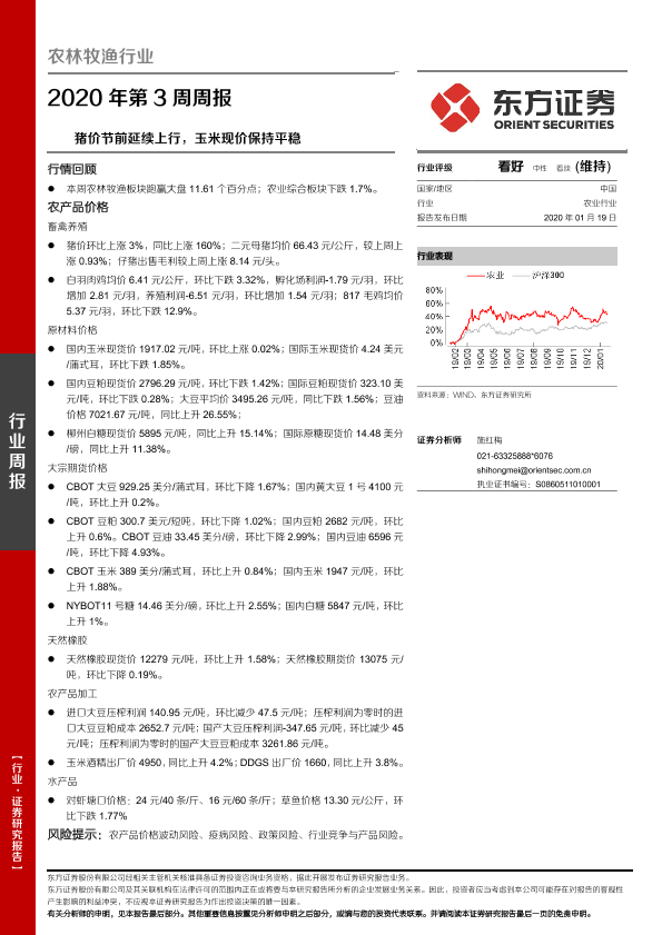 【东方证券】【20200119】农林牧渔行业2020年第3周周报:猪价节前延续上行,玉米现价保持平稳-16页
