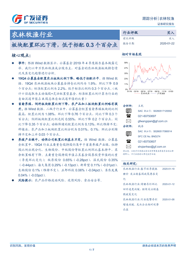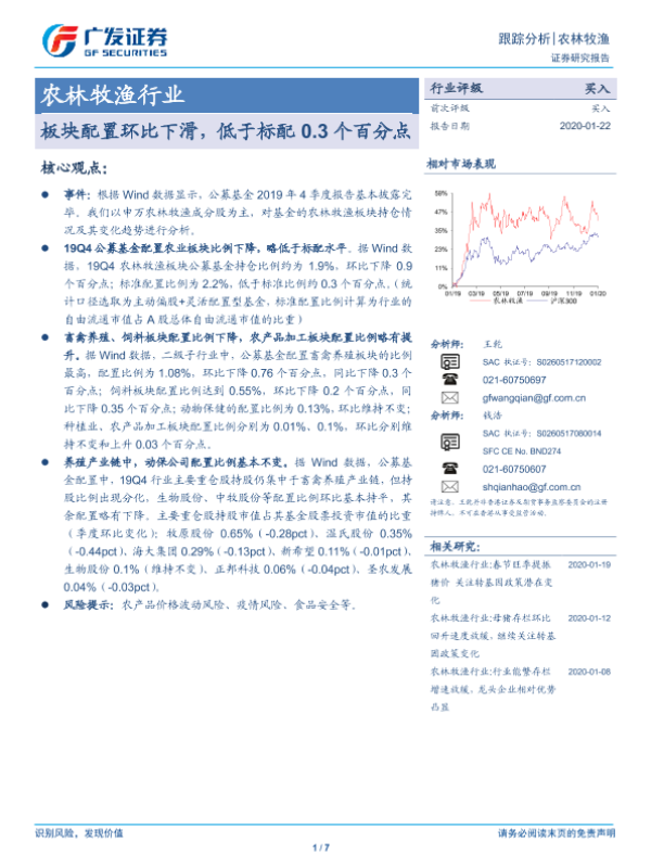 【广发证券】【20200122】农林牧渔行业:板块配置环比下滑,低于标配0.3个百分点-7页