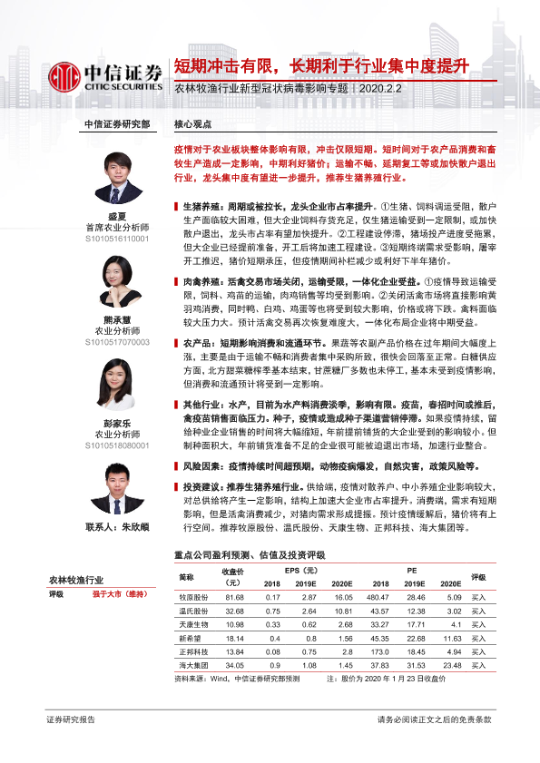 【中信证券】【20200202】农林牧渔行业新型冠状病毒影响专题:短期冲击有限,长期利于行业集中度提升-12页
