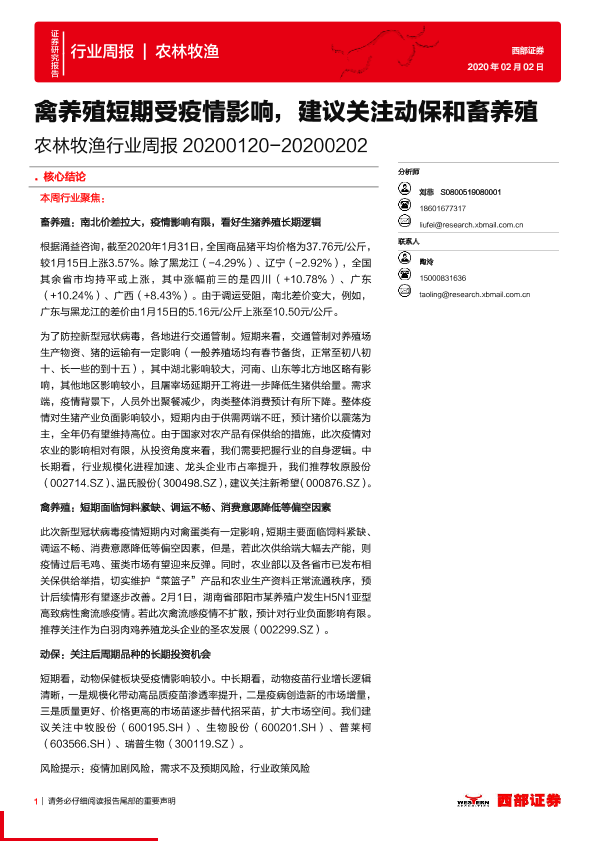 【西部证券】【20200202】20200202-西部证券-农林牧渔行业周报:禽养殖短期受疫情影响,建议关注动保和畜养殖-10页