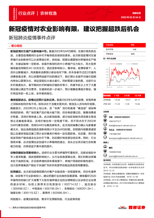 【西部证券】【20200204】农林牧渔行业:新冠肺炎疫情事件点评-新冠疫情对农业影响有限,建议把握超跌后机会-12页