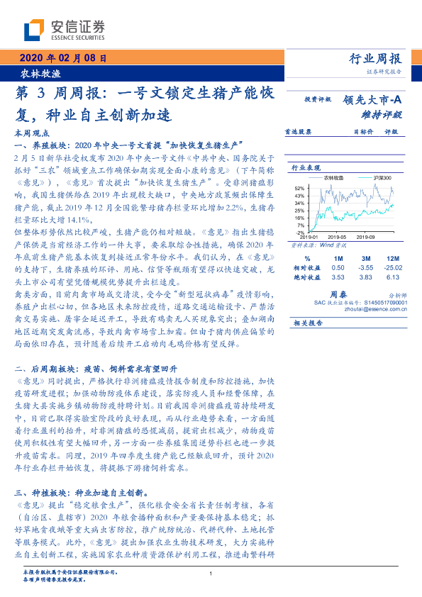 【安信证券】【20200208】农林牧渔行业第3周周报:一号文锁定生猪产能恢复,种业自主创新加速-20页