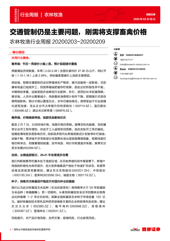 【西部证券】【20200209】农林牧渔行业周报:交通管制仍是主要问题,刚需将支撑畜禽价格-14页
