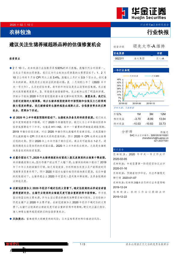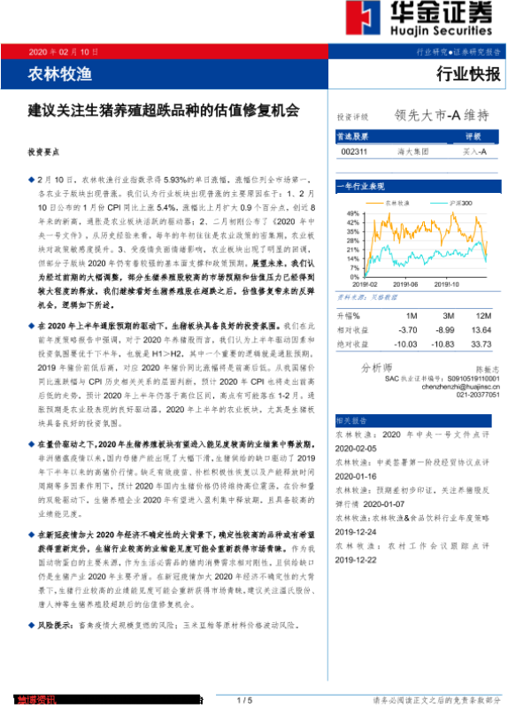 【华金证券】【20200210】农林牧渔:建议关注生猪养殖超跌品种的估值修复机会-5页