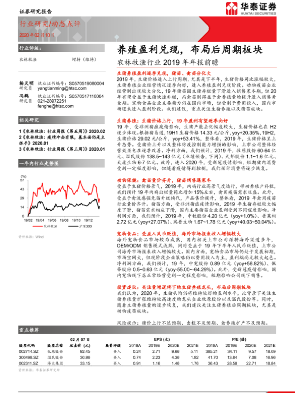 【华泰证券】【20200210】农林牧渔行业2019年年报前瞻:养殖盈利兑现,布局后周期板块-3页