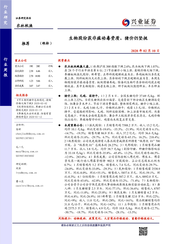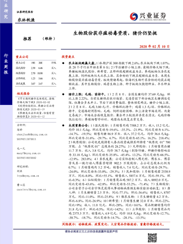 【兴业证券】【20200210】20200210-兴业证券-农林牧渔行业周报:生物股份获非瘟动毒资质,猪价仍坚挺-15页