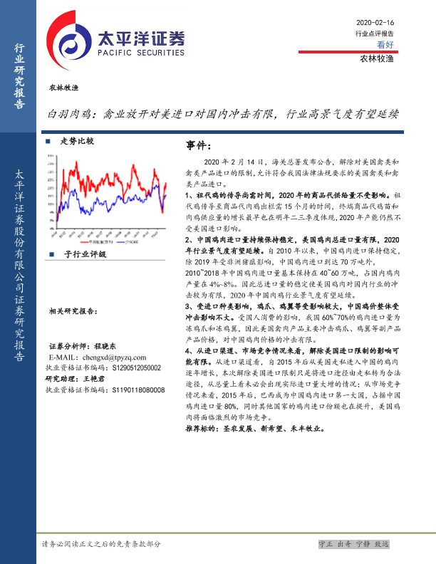 【太平洋证券】【20200216】农林牧渔:羽肉鸡:禽业放开对美进口对国内冲击有限,行业高景气度有望延续-7页