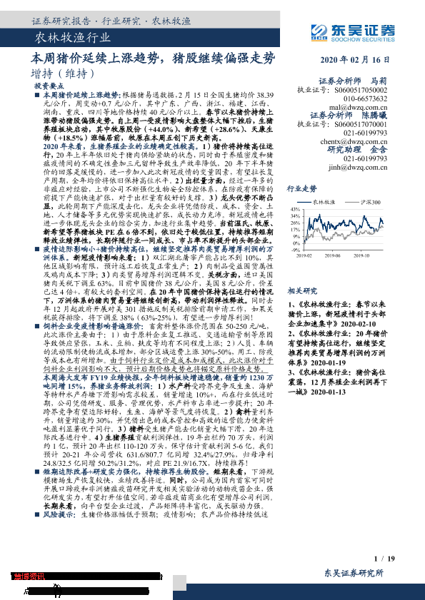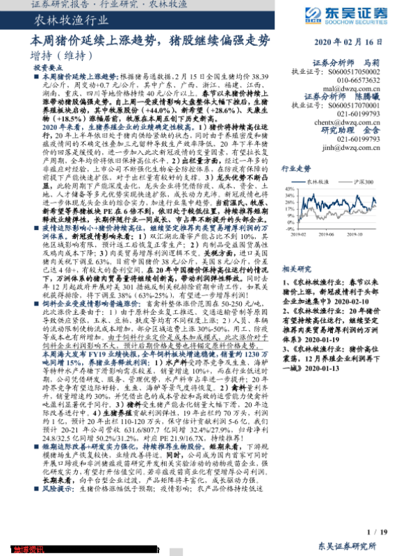【东吴证券】【20200216】20200216-东吴证券-农林牧渔行业:本周猪价延续上涨趋势,猪股继续偏强走势-19页