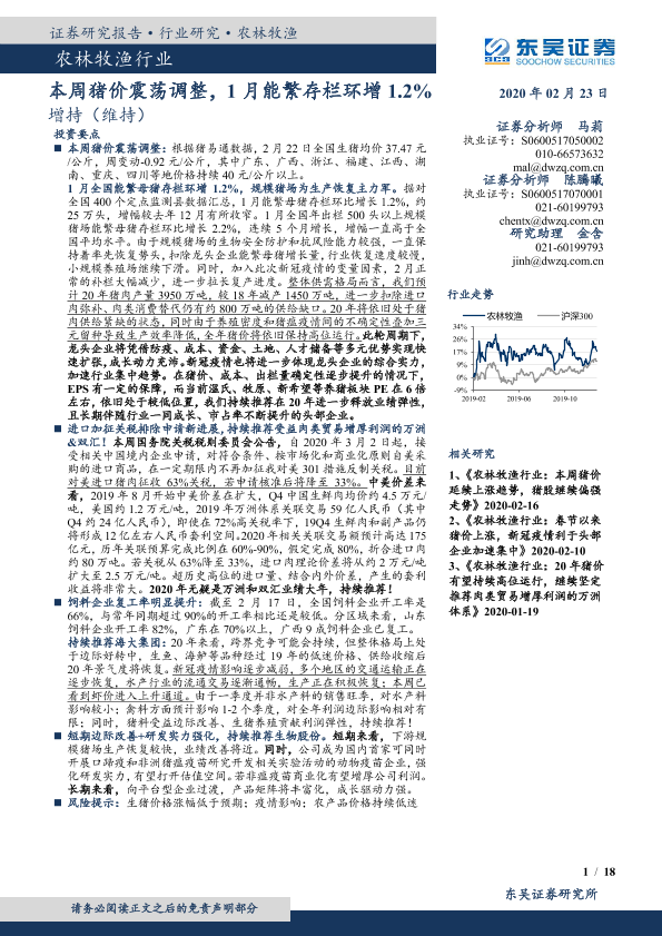 【东吴证券】【20200223】20200223-东吴证券-农林牧渔行业:本周猪价震荡调整,1月能繁存栏环增1.2%-18页