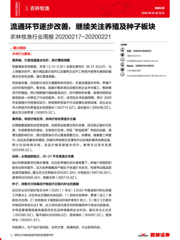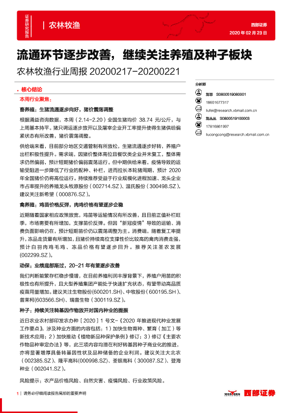 【西部证券】【20200223】农林牧渔行业周报:流通环节逐步改善,继续关注养殖及种子板块-12页