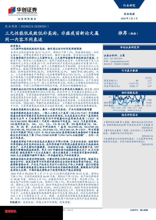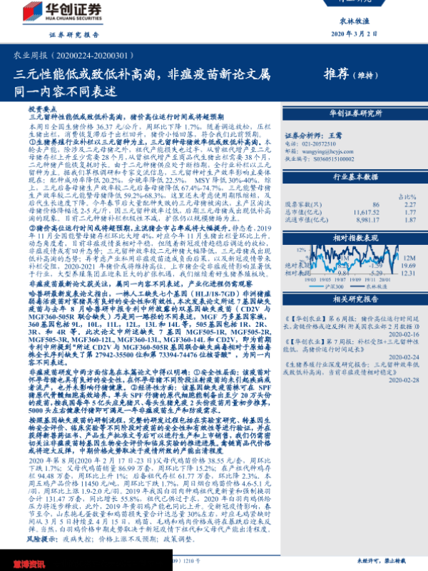 【华创证券】【20200302】20200302-华创证券-农业周报:三元性能低或致低补高淘,非瘟疫苗新论文属同一内容不同表述-50页