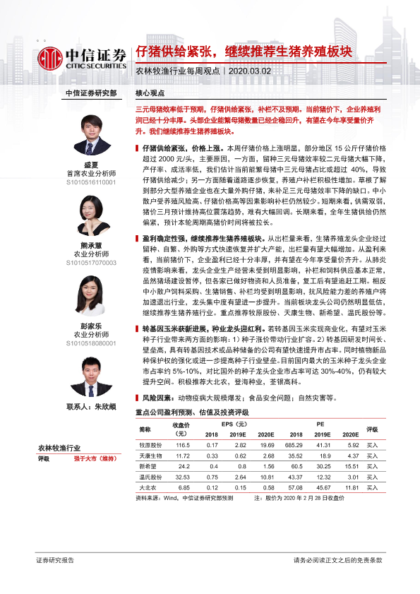 【中信证券】【20200302】20200302-中信证券-农林牧渔行业每周观点:仔猪供给紧张,继续推荐生猪养殖板块-6页