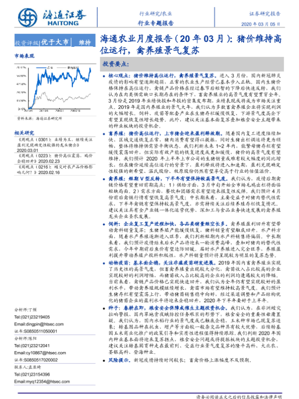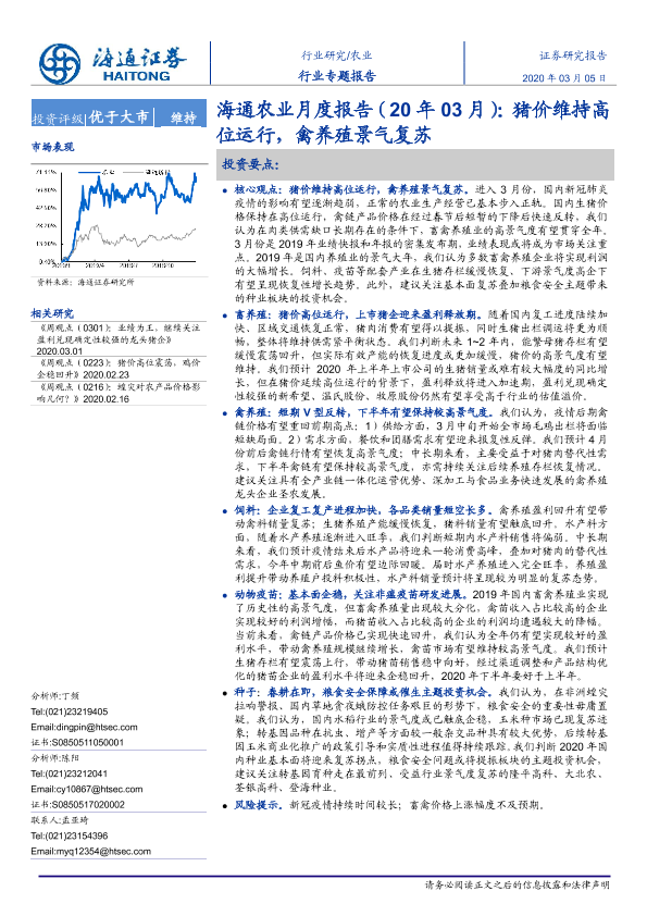 【海通证券】【202003】海通农业月度报告(20年03月):猪价维持高位运行,禽养殖景气复苏-19页