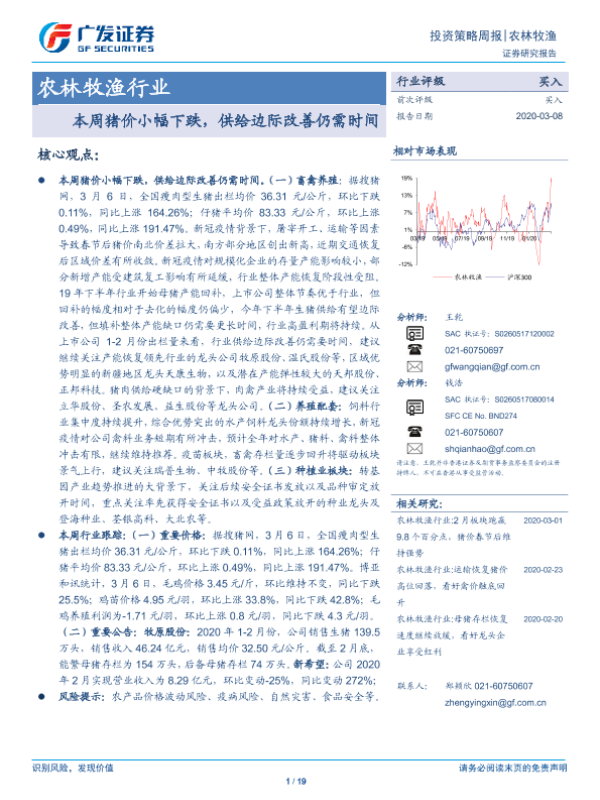 【广发证券】【20200308】20200308-广发证券-农林牧渔行业投资策略周报:本周猪价小幅下跌,供给边际改善仍需时间-19页
