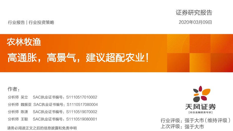 【天风证券】【20200309】20200309-天风证券-农林牧渔行业投资策略:高通胀,高景气,建议超配农业!-22页