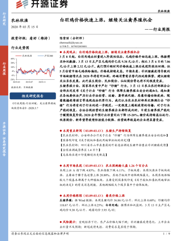 【开源证券】【20200315】20200315-开源证券-农林牧渔行业周报:白羽鸡价格快速上涨,继续关注禽养殖机会-9页