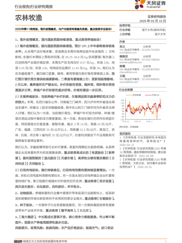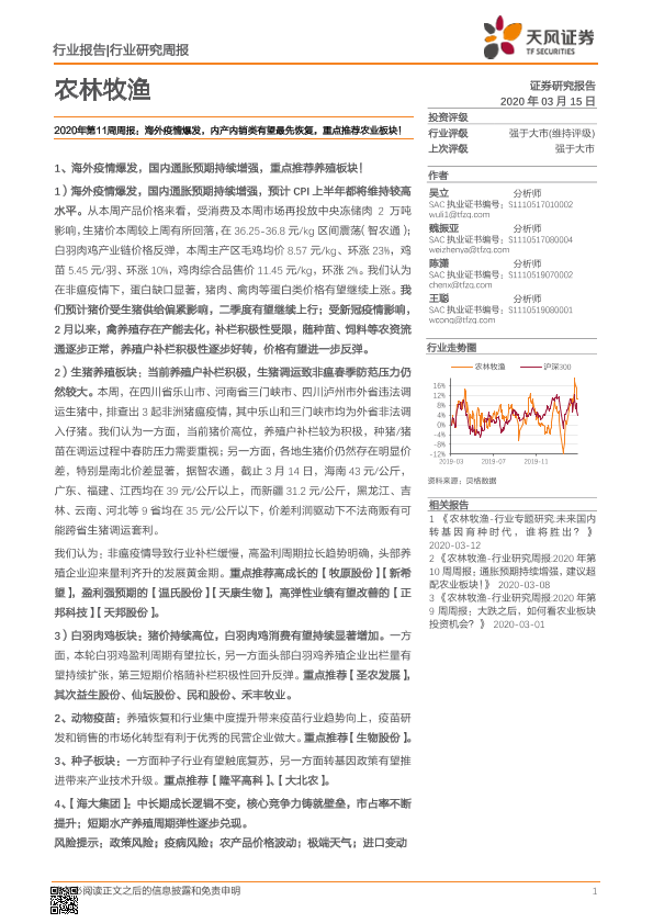 【天风证券】【20200315】2020年第11周周报:海外疫情爆发,内产内销类有望最先恢复,重点推荐农业板块!-15页