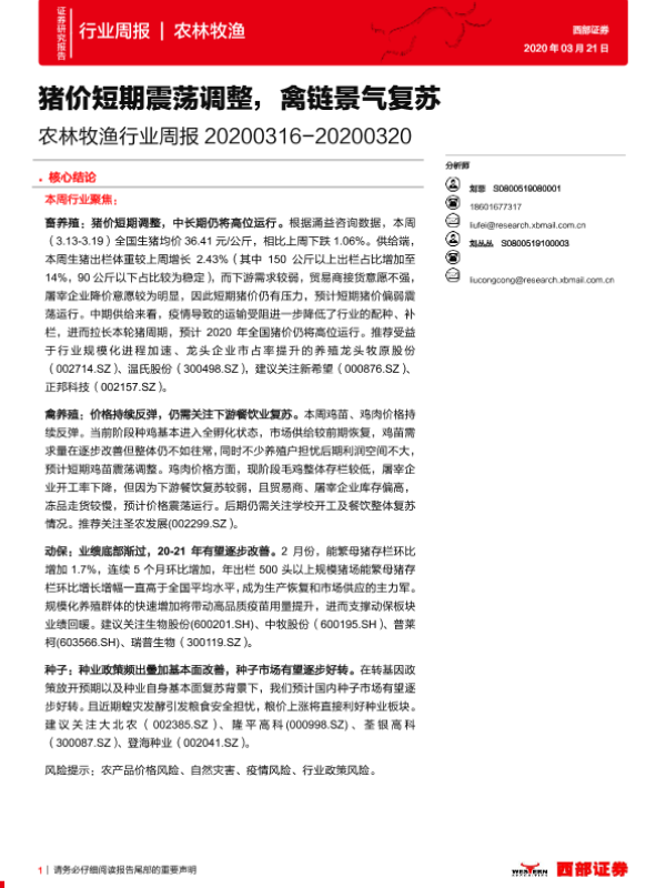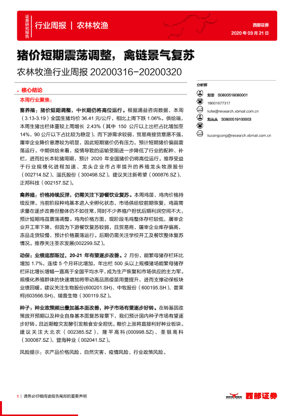 【西部证券】【20200321】20200321-西部证券-农林牧渔行业周报:猪价短期震荡调整,禽链景气复苏-13页