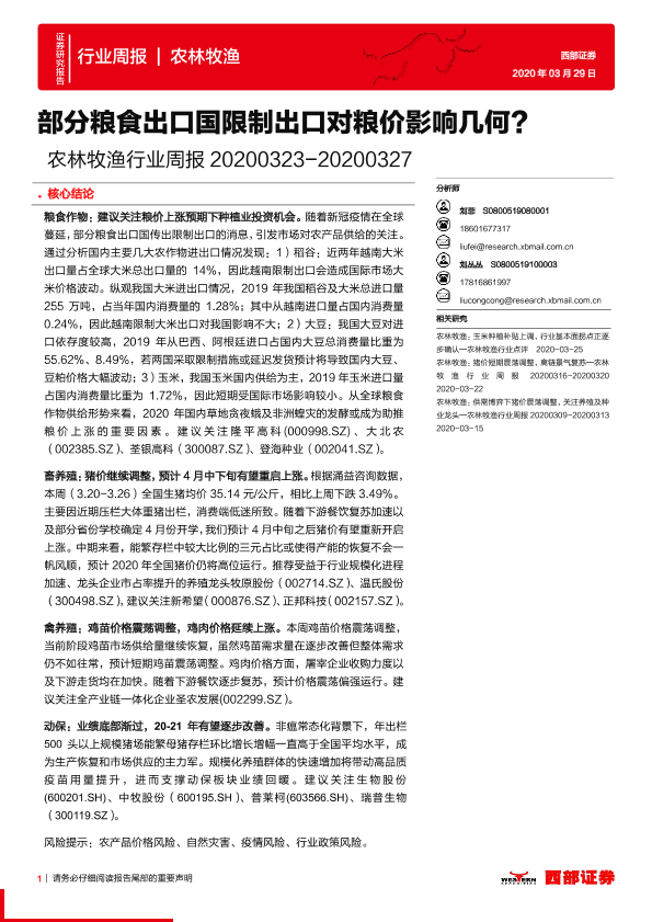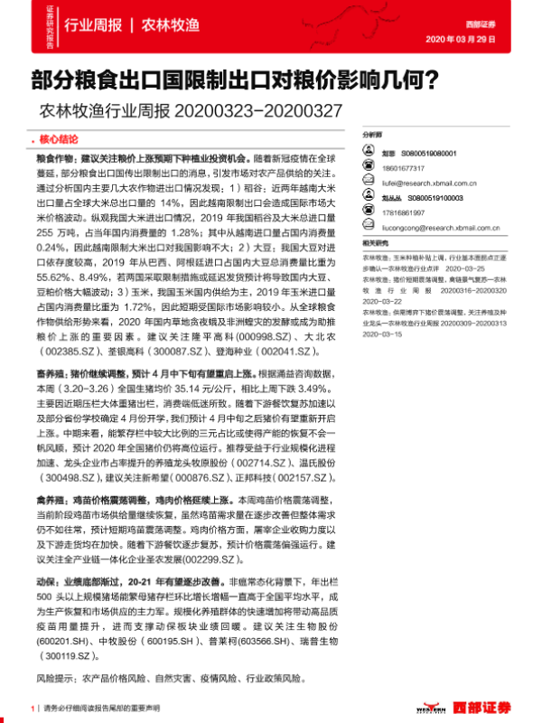 【西部证券】【20200329】农林牧渔行业周报:部分粮食出口国限制出口对粮价影响几何?-13页