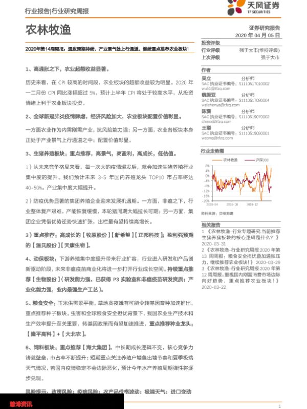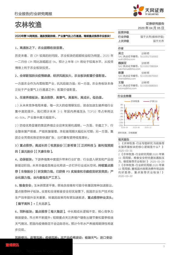 【天风证券】【20200405】20200405-天风证券-农林牧渔2020年第14周周报:通胀预期持续,产业景气处上行通道,继续重点推荐农业板块!-15页