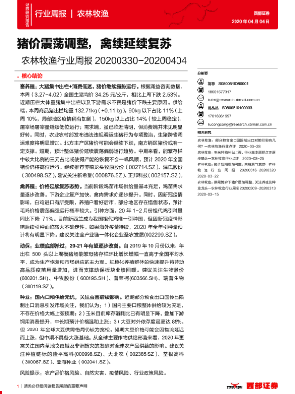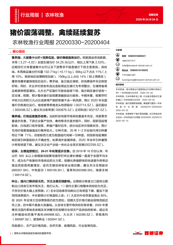 【西部证券】【20200404】20200404-西部证券-农林牧渔行业周报:猪价震荡调整,禽续延续复苏-13页