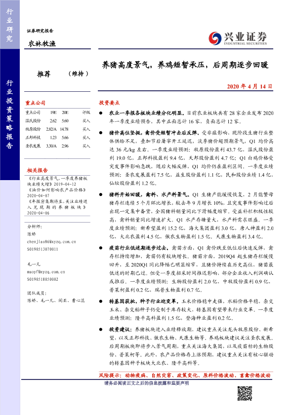 【兴业证券】【20200414】20200414-兴业证券-农林牧渔:养猪高度景气,养鸡短暂承压,后周期逐步回暖-17页