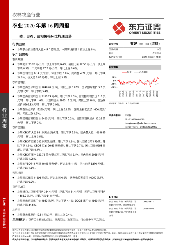 【东方证券】【20200419】农业2020年第16周周报:猪、白鸡、豆粕价格环比均现回落-16页