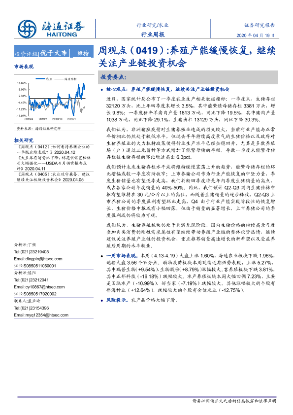 【海通证券】【20200419】20200419-海通证券-农业周观点:养殖产能缓慢恢复,继续关注产业链投资机会-3页