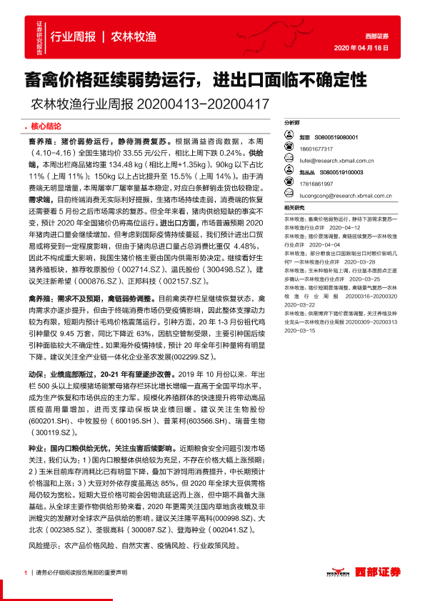 【西部证券】【20200418】20200418-西部证券-农林牧渔行业周报:畜禽价格延续弱势运行,进出口面临不确定性-13页