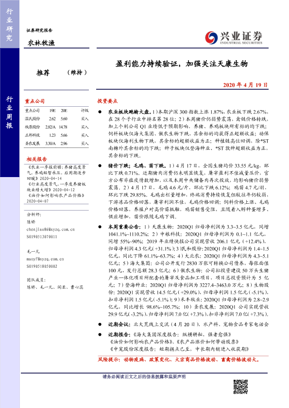 【兴业证券】【20200419】20200419-兴业证券-农林牧渔行业周报:盈利能力持续验证,加强关注天康生物-15页