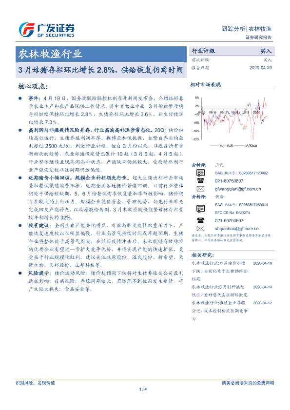 【广发证券】【20200420】农林牧渔行业跟踪分析:3月母猪存栏环比增长2.8%,供给恢复仍需时间-4页